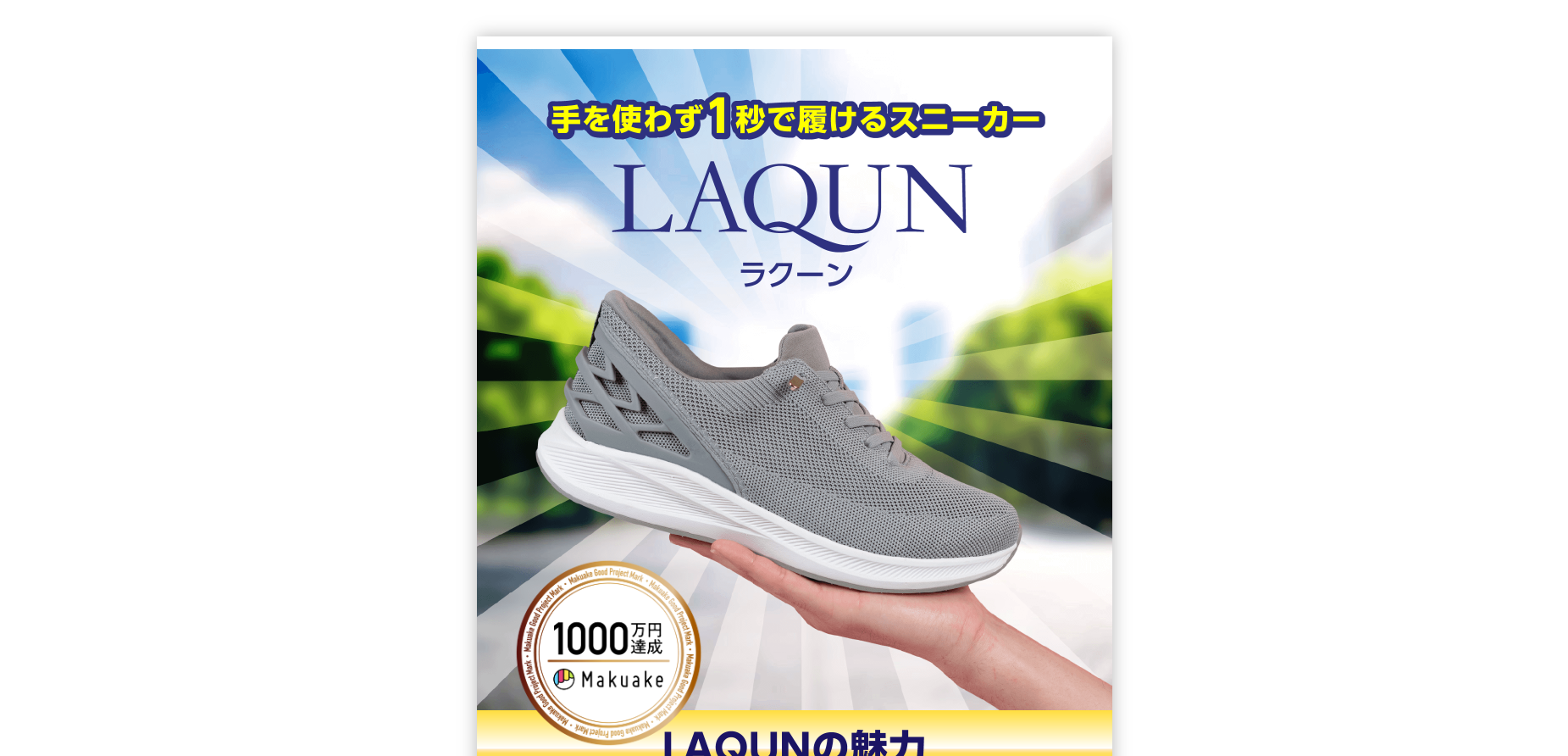 「手を使わずに1秒で履けるスニーカーLAQUN(ラクーン)」は、靴を履くという日常動作を見直したスニーカーです。
